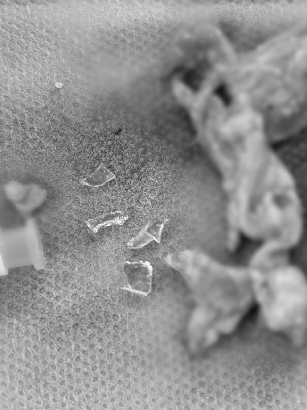 Glass fragments of varying sizes deeply embedded under the skin and in the skull. Photo: AIH