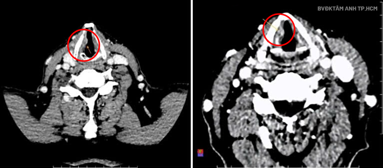 CT scan showing the tumor on the right vocal cord. Photo: Tam Anh General Hospital |