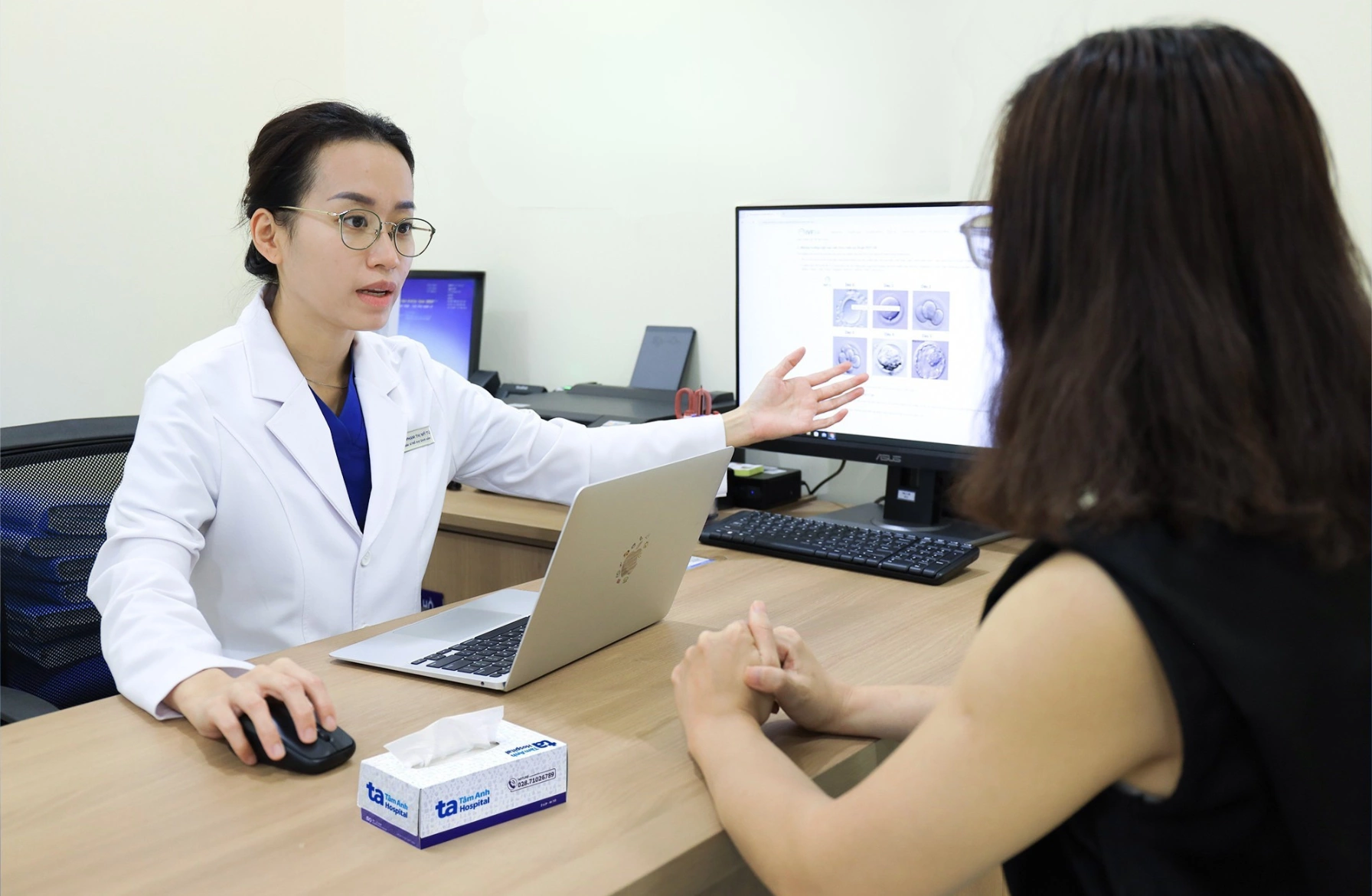 Doctor Tu consults Tham on embryos. Photo: IVF Tam Anh |
