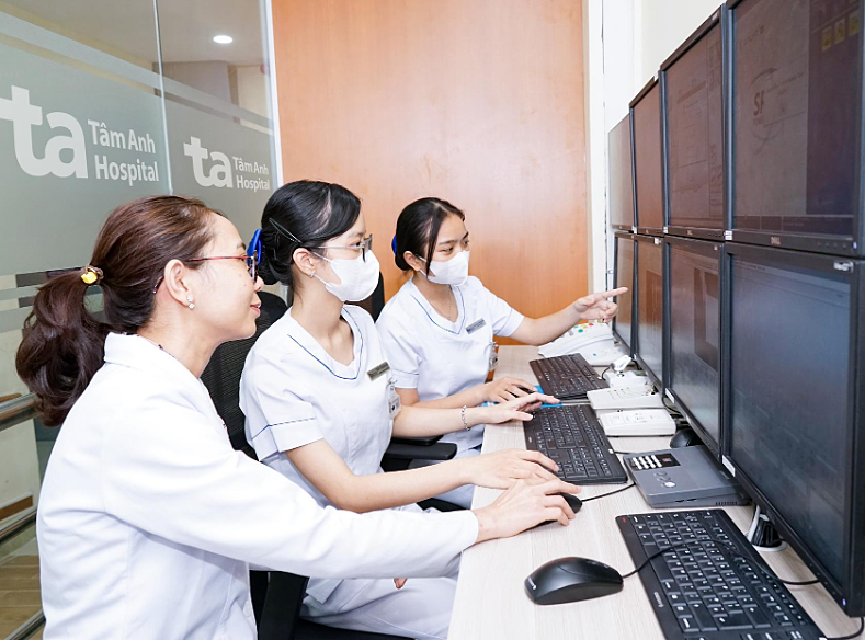 Doctor Dang (far left) monitors a patient undergoing radiation therapy via a computer system. Photo: Tam Anh General Hospital |