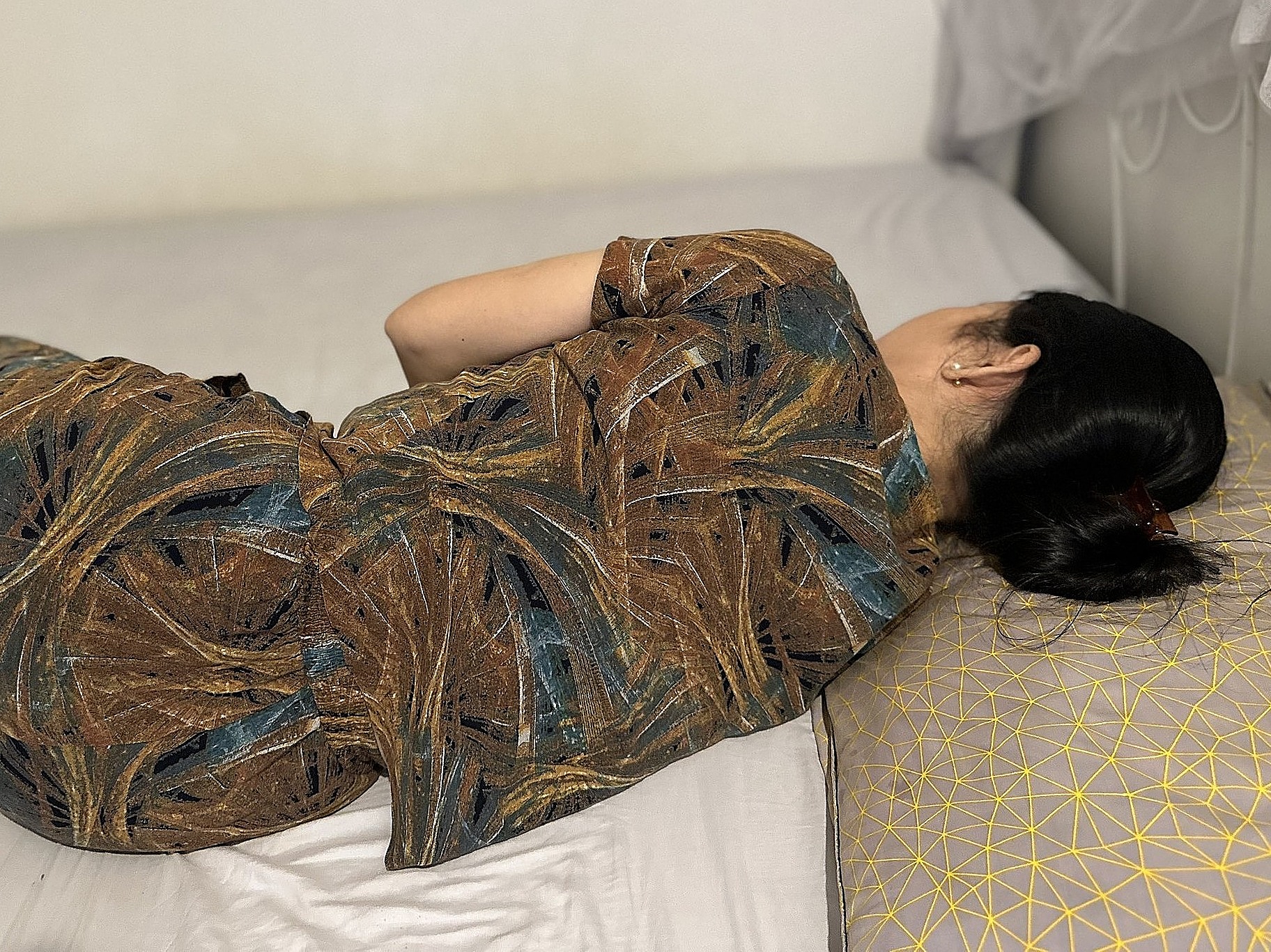 Side sleeping with a small pillow between the two knees prevents the upper leg from shifting off the spinal axis, helping to align the spine, hips, and pelvis. This reduces pressure on the back, hips, and knees, relaxes muscles, improves blood circulation, prevents numbness, and alleviates sciatica pain. This posture is particularly beneficial for pregnant women and individuals with back or hip pain.