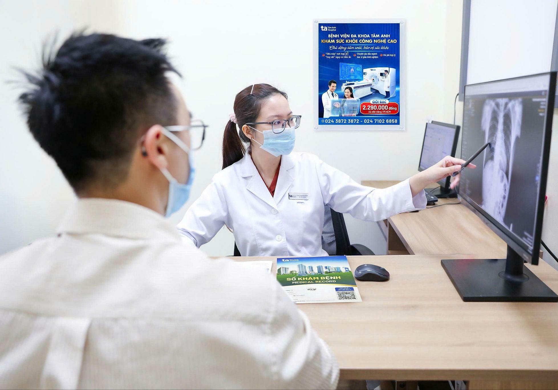 Doctor Thuy explains an X-ray image to a patient during a health check-up. Photo: Tam Anh General Hospital |