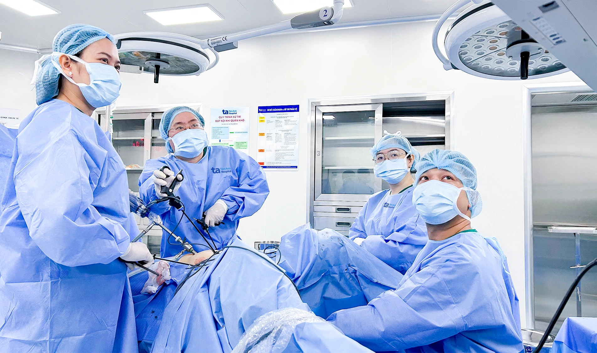 Doctor Lua (second from left) and the team performing a laparoscopic hysterectomy for Hong. *Photo: Tam Anh General Hospital* |