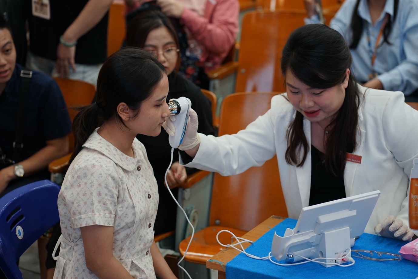 Pharmacist Bao Chi examined students' skin and offered advice on caring for acne-prone complexions. *Photo: Inolab Derma*