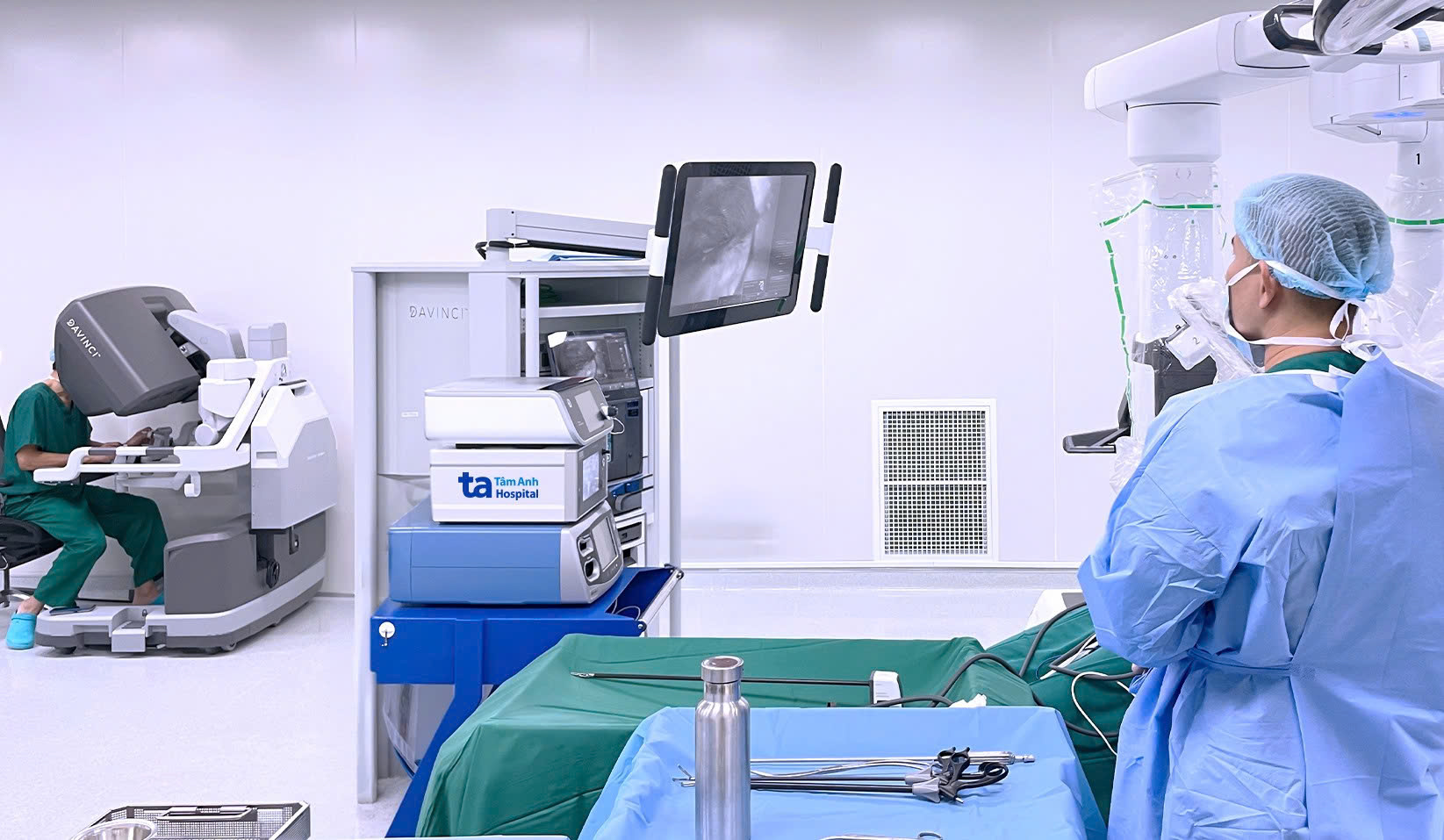 Associate Professor Vinh (left) operates the Da Vinci Xi robot for myasthenia gravis surgery. *Photo: Tam Anh General Hospital*