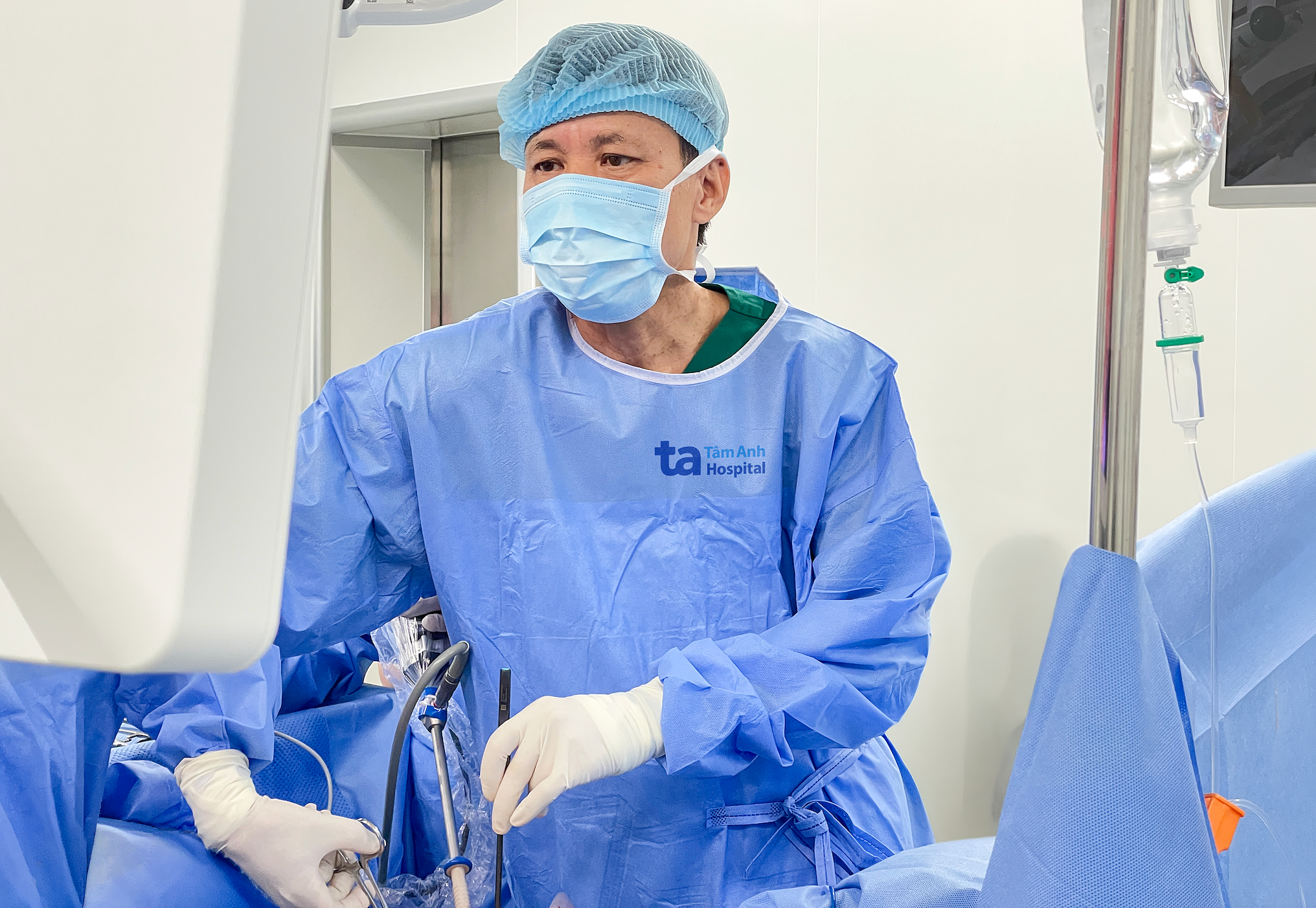 Associate Professor Vinh performs endoscopic surgery to treat lung tumors for a patient. *Tam Anh General Hospital*.
