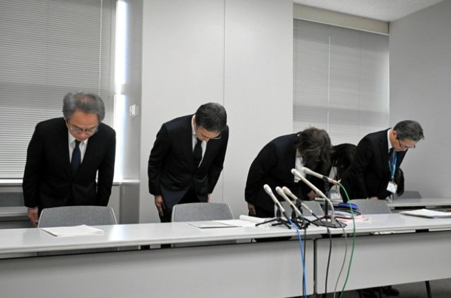Chiba Cancer Center Director Atsushi Kato (second from left), along with colleagues, apologized for the mistaken surgery incident on 6/2. Photo: *Akira Miyashita*.