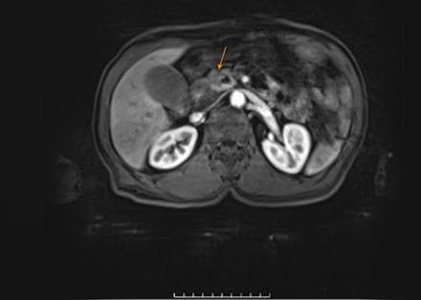 After several weeks of medication for elevated liver enzymes, Mr. Quang's skin and eye whites turned yellow, prompting him to visit Tam Anh General Hospital, TP HCM. Tests revealed his liver enzymes were 30 times higher than normal, with ALT (GPT) reaching 1,600 U/L (normal is around 50 U/L). A CT scan of the pancreas and an abdominal MRI identified a lesion approximately 20 mm in size in the head of the pancreas. This lesion was compressing and invading the pancreatic duct, which was dilated to 7 mm. The gallbladder wall was edematous, and the common bile duct was dilated both inside and outside the liver.