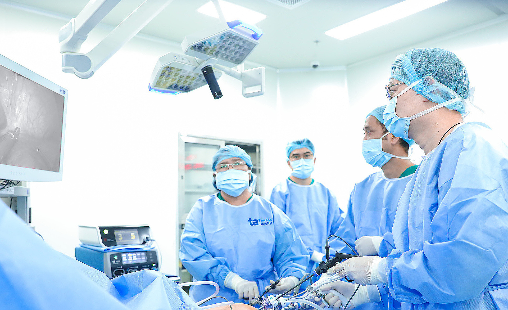 Doctor Bich (left) performing laparoscopic pancreaticoduodenectomy on Mr. Quang. Photo: Hospital provided