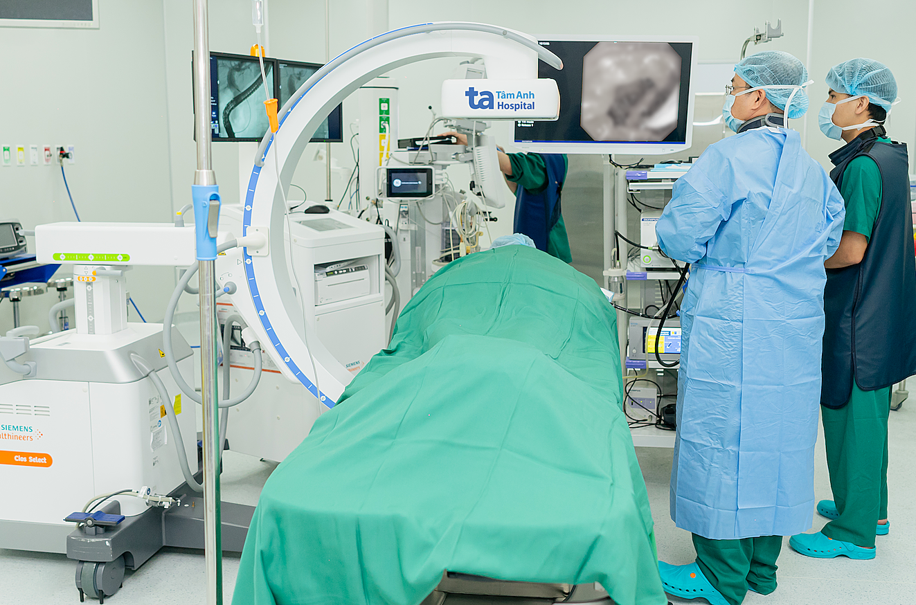 Doctor Binh (in a blue shirt) performs endoscopic retrograde cholangiopancreatography to remove stones and liver flukes. *Photo: Tam Anh General Hospital* |