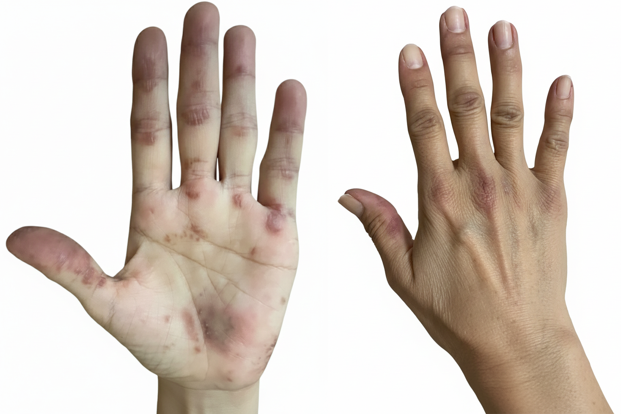 Initially, Ms. My was diagnosed with interstitial lung disease and received symptomatic treatment. Over the past two years, the skin on both her hands began to peel, thicken, and crack, leading to a dermatitis diagnosis. More recently, she experienced severe shortness of breath, progressive muscle weakness, weight loss, poor appetite, and difficulty walking.