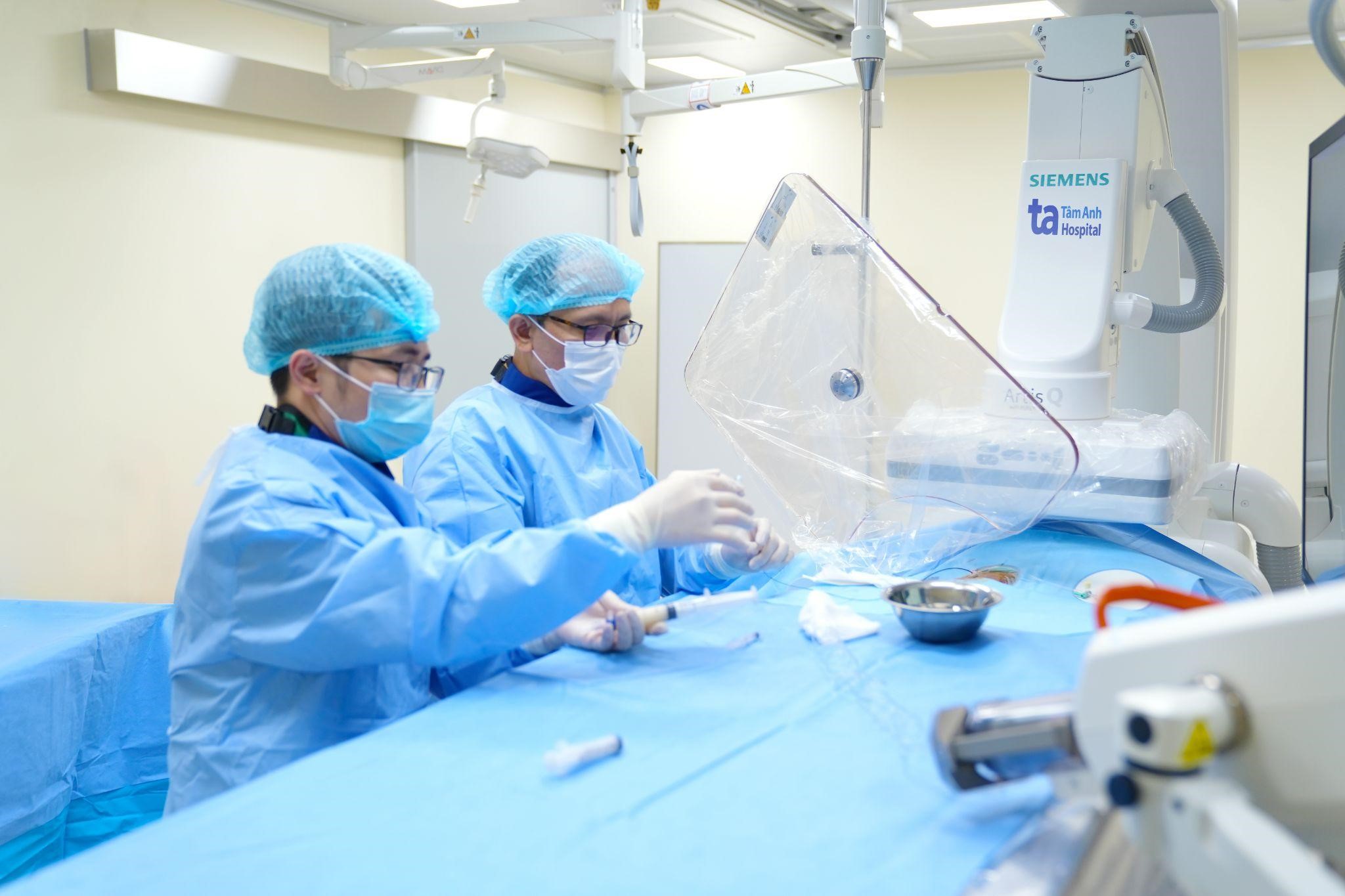 Associate Professor Hien and his team placing a stent to reopen Mr. Dung's vein. Photo: Tam Anh General Hospital |