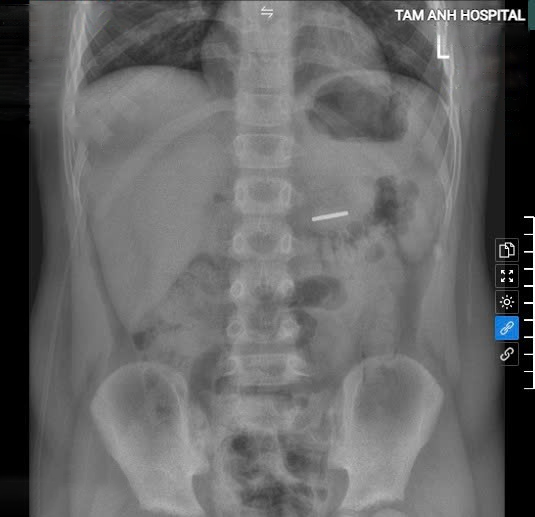 Cuong was admitted to the hospital in a conscious state with normal heart and lung function. An X-ray confirmed the presence of a 2.5 cm radiopaque foreign body in his stomach. Doctor Hoang performed an endoscopy and successfully retrieved a dark brown magnet from the D3 duodenum. The boy recovered well and was discharged one day after the intervention.