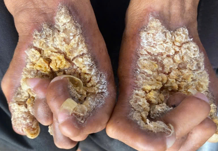 "Tree-man syndrome" typically manifests early, on average between ages six and seven, or even as early as one to two years old. Initial lesions resemble tinea versicolor, seborrheic keratosis, or flat warts, appearing on the trunk, neck, face, hands, and feet. Over time, these skin patches thicken, keratinize, elevate, and develop a rough, bark-like or root-like surface, leading to deformities and severely limiting mobility. Previously, Vietnam recorded another case in Dong Nai, a 63-year-old individual, with milder lesions localized to the right lower leg.