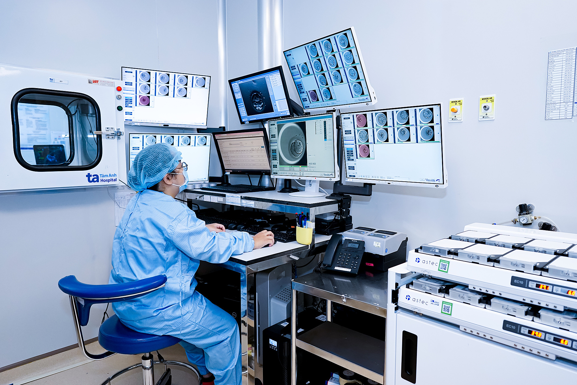 Embryologists observe embryo development cultured in a time-lapse system integrated with artificial intelligence. Photo: IVF Tam Anh |