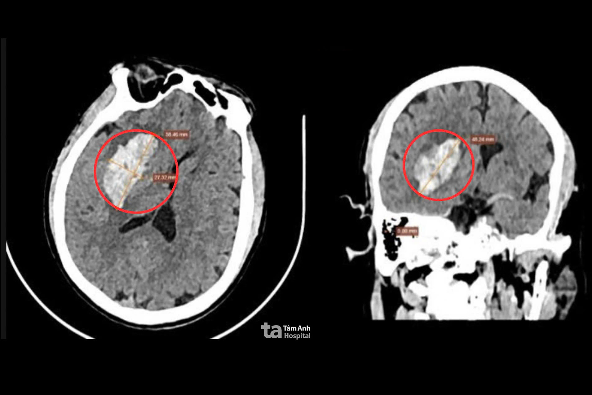 Nghia experienced a sudden, severe headache, collapsed, and developed left-sided weakness and slurred speech. His family rushed him to a local hospital. A CT scan revealed a right-hemisphere brain hemorrhage, prompting his transfer to Tam Anh General Hospital in TP HCM for intervention. Upon arrival, Nghia's blood pressure was high (153/94 mmHg), his left arm strength was 2/5, his left leg strength was 3/5, and his consciousness was declining. Imaging showed a roughly 6 cm hematoma in his right brain causing cerebral edema, compressing the right lateral ventricle, and shifting the midline 4 mm to the left.