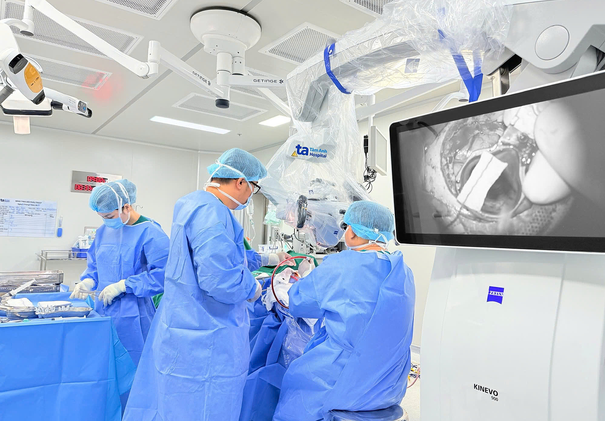 After consultation, Nghia was scheduled for minimally invasive surgery (MIS) assisted by artificial intelligence (AI). A small incision was made in his scalp, and a high-speed drill created a small, roughly 2 cm "keyhole" opening in his skull. The specialized BrainPath device was inserted deep into the brain, selectively following natural grooves. Surgeons gently separated brain tissue to create a safe corridor to the hematoma without damaging healthy tissue.