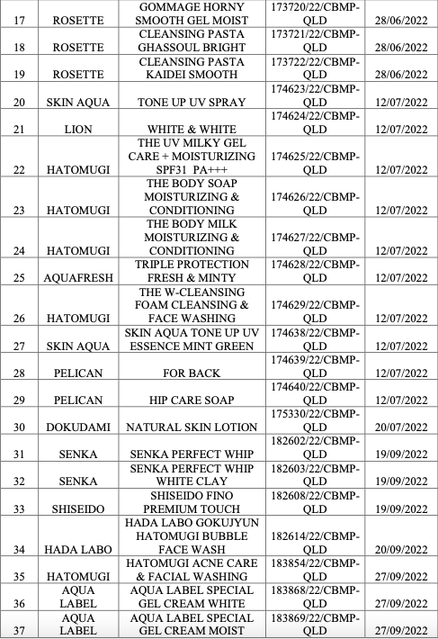 List of recalled cosmetic products. Photo: Drug Administration of Vietnam |