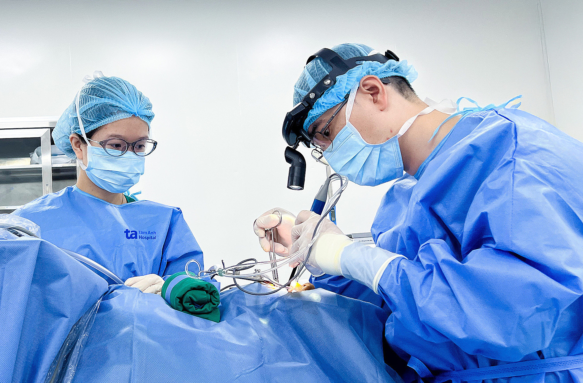 Doctor Huu (seated) performs abscess drainage surgery for An. Photo: Tam Anh General Hospital