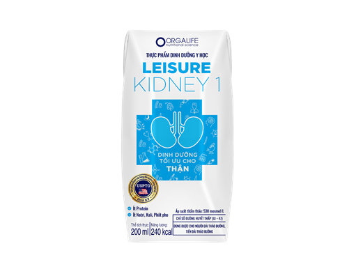 Leisure Kidney 1, a medical nutritional food, is designed for patients with man tinh kidney disease not yet on renal replacement therapy or requiring a reduced-protein diet. Its protein content is lower but still provides all 9 essential amino acids, helping maintain muscle mass and reduce kidney burden. The product limits sodium, potassium, and phosphorus, has a low GI (GI = 47), is rich in MUFA and PUFA, and supplements natural fiber, FOS, and 26 vitamins and minerals.