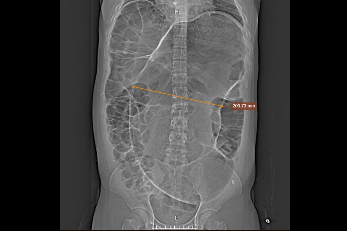 Previously, Minh suffered from constipation, which was treated with medication and a rectal tube. Three months later, his abdomen became severely distended, causing shortness of breath, abdominal pain, and an inability to eat, requiring nutritional infusions. A 1975-slice CT scan at Tam Anh General Hospital revealed sigmoid colon volvulus (the final segment of the large intestine), with the mesentery blood vessels and the sigmoid colon loop twisted, measuring 20 cm in diameter—nearly 7 times larger than normal. The intestinal lumen was filled with gas and waste, and the intestinal wall was thin.
