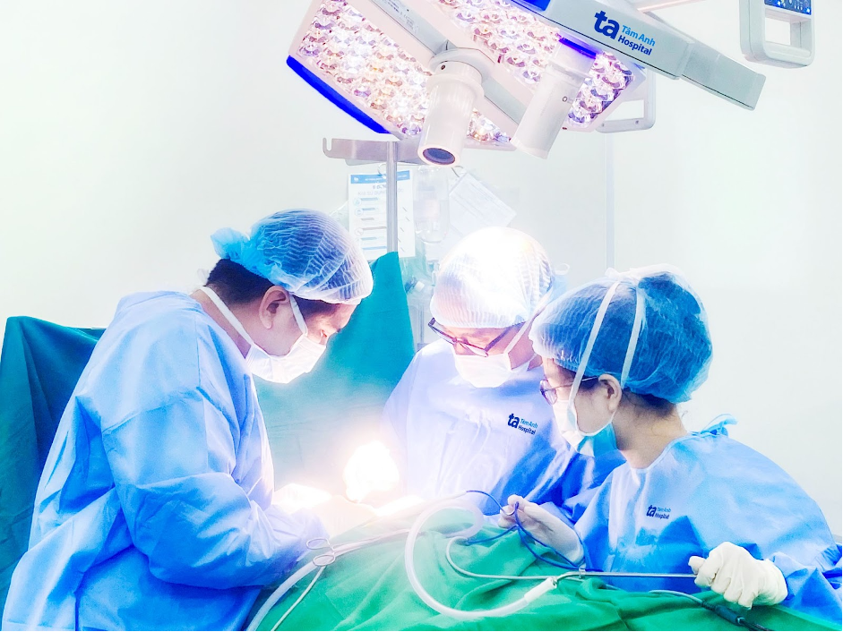 Dr. Huan (center) and the surgical team removing Toan's large parotid gland tumor. Photo: Tam Anh General Hospital |