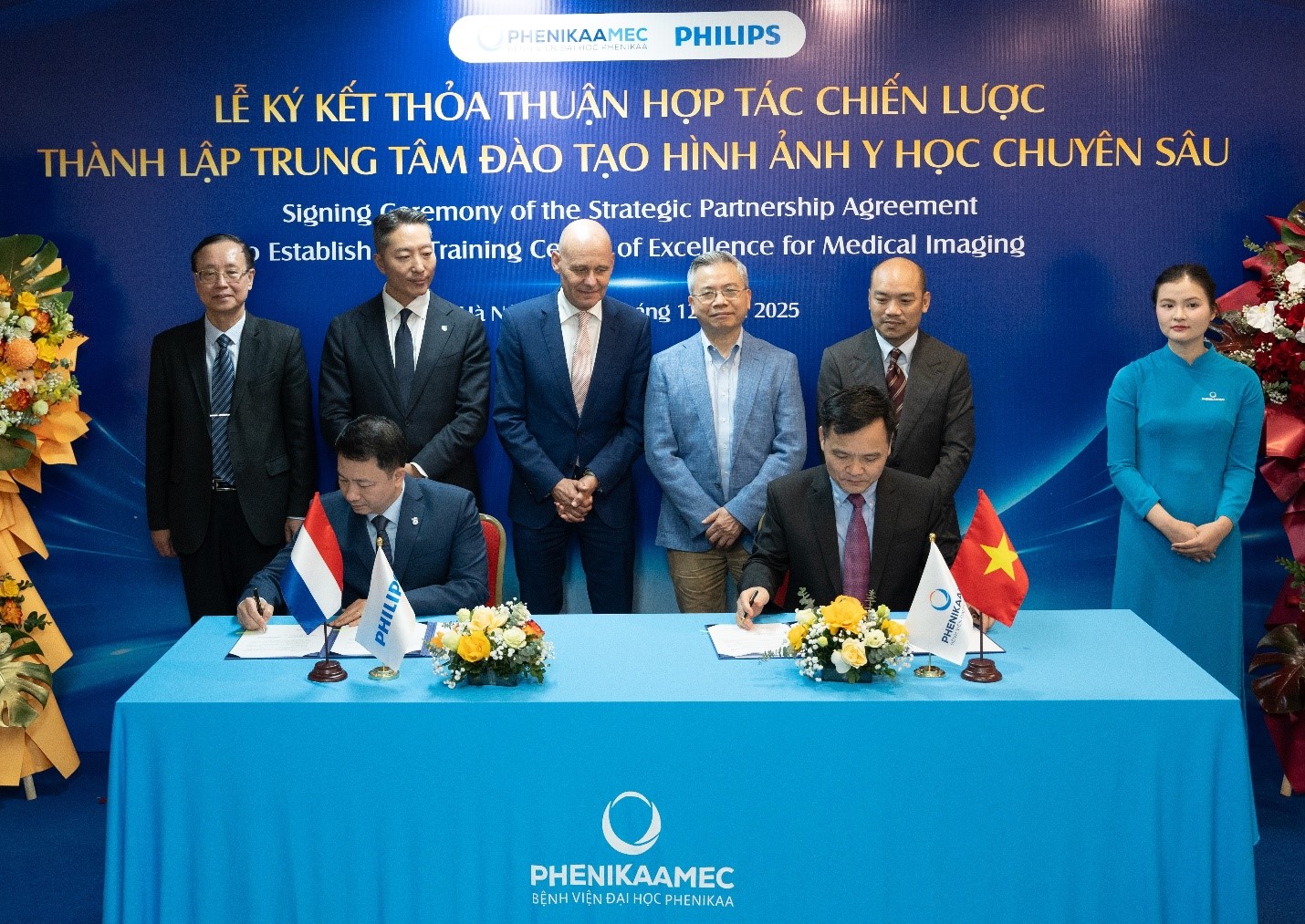 On 15/12, Phenikaa University Hospital (PhenikaaMec) and Philips Group announced a strategic cooperation to establish a specialized medical imaging training center. This center will utilize 31 advanced artificial intelligence-integrated image processing tools developed by Philips. It marks the first large-scale specialized medical imaging training center in Vietnam to be implemented through a partnership with Philips. On this occasion, PhenikaaMec also inaugurated its 3T Ingenia Elition X magnetic resonance imaging system, which shortens scanning time, improves diagnostic accuracy, and optimizes clinical procedures.