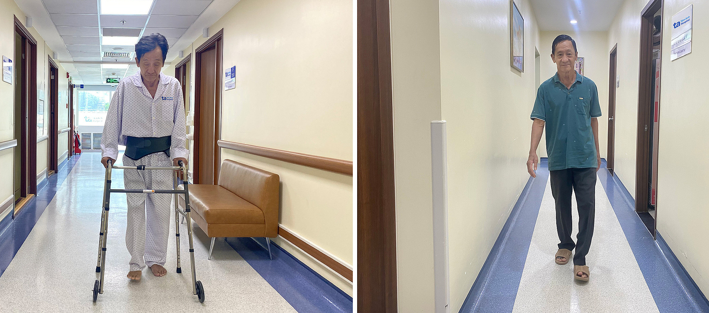 Mr. Nien walking independently before discharge (left) and during a follow-up visit. *Photo: Tam Anh General Hospital* |
