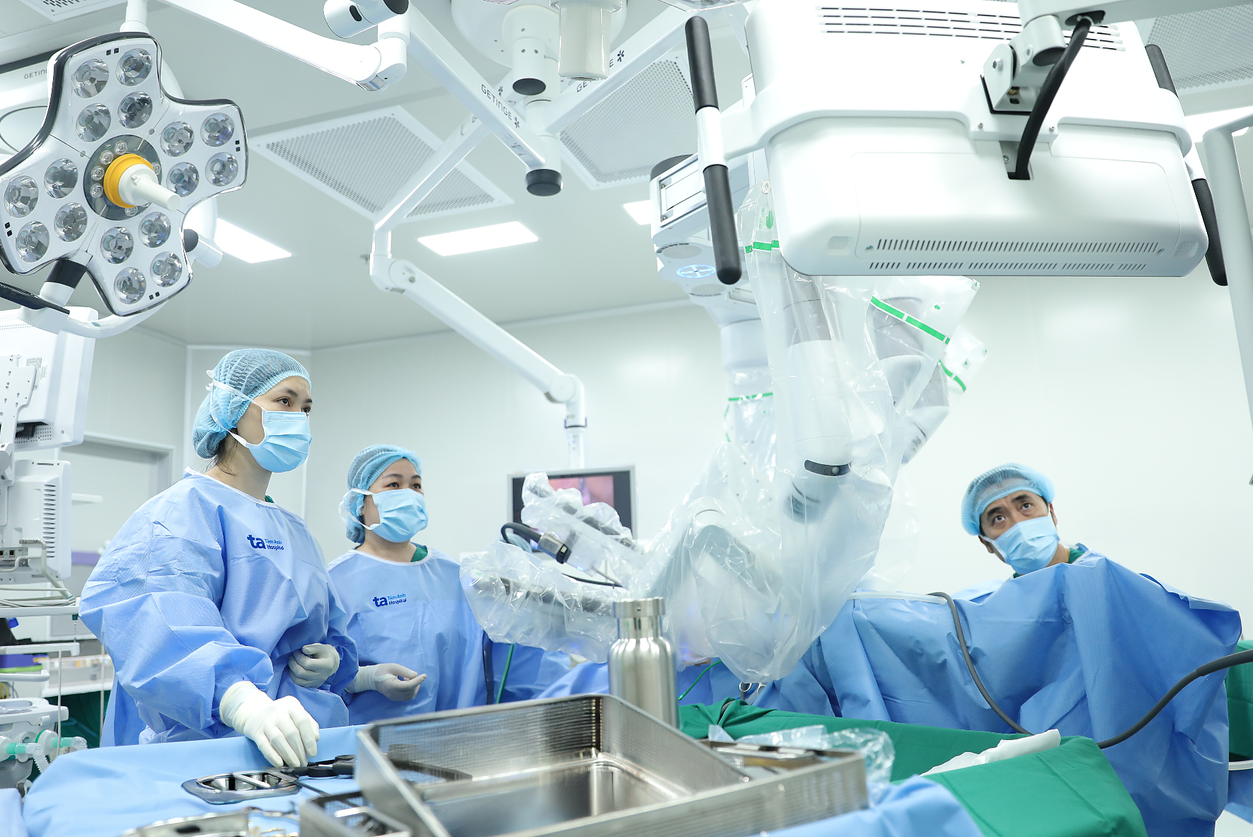 The team performing robot-assisted laparoscopic surgery with the Da Vinci Xi system for Ms. Thao's bladder and uterine prolapse. Photo: Tam Anh General Hospital