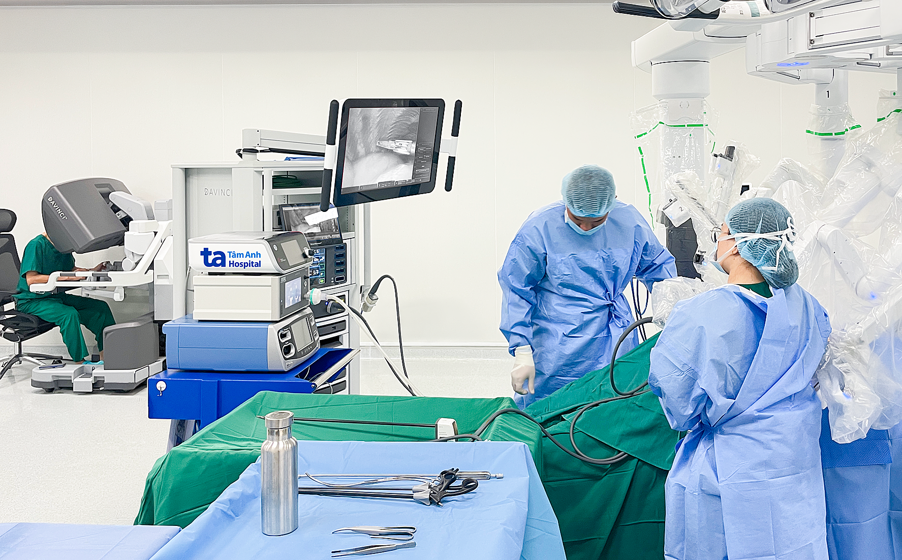 Associate Professor Vinh (left) operates the da Vinci Xi robot to resect a thymic tumor for a patient. *Photo: Tam Anh General Hospital*