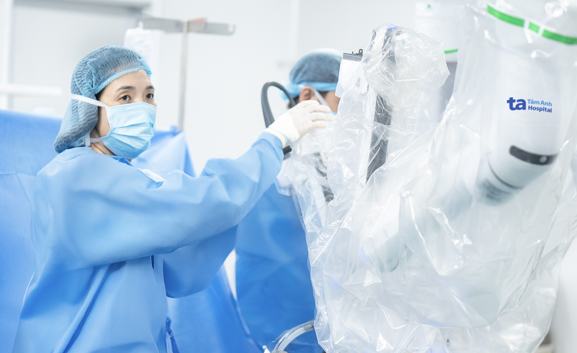 Doctor Lien and his team performing ureteral reconstruction on Mrs. Mai using the Da Vinci Xi robot. Photo: Tam Anh General Hospital |