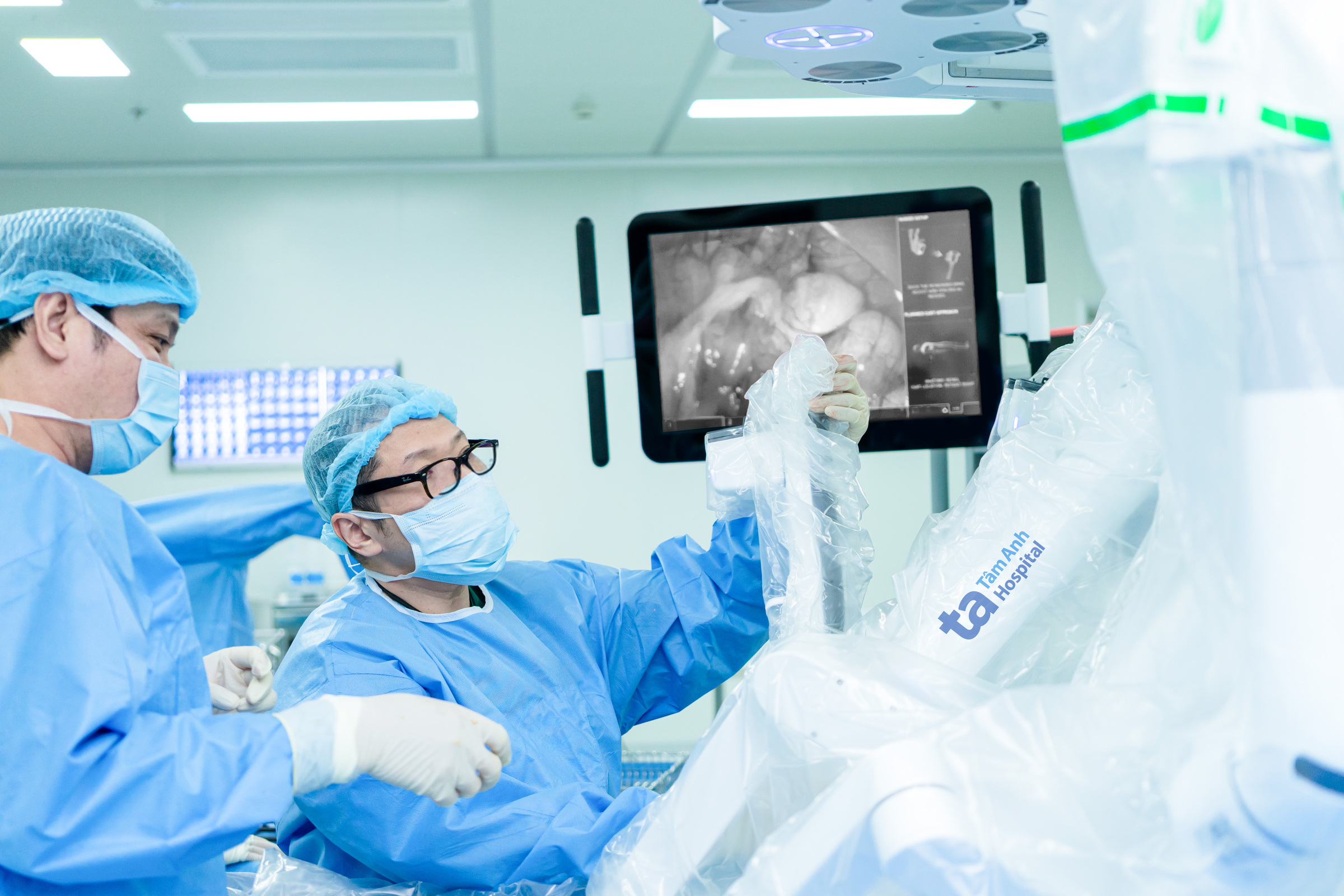Dr. Duc (front) connects the robotic arms to the trocars, instruments that allow access to the surgical site. Photo: *Tam Anh General Hospital* |