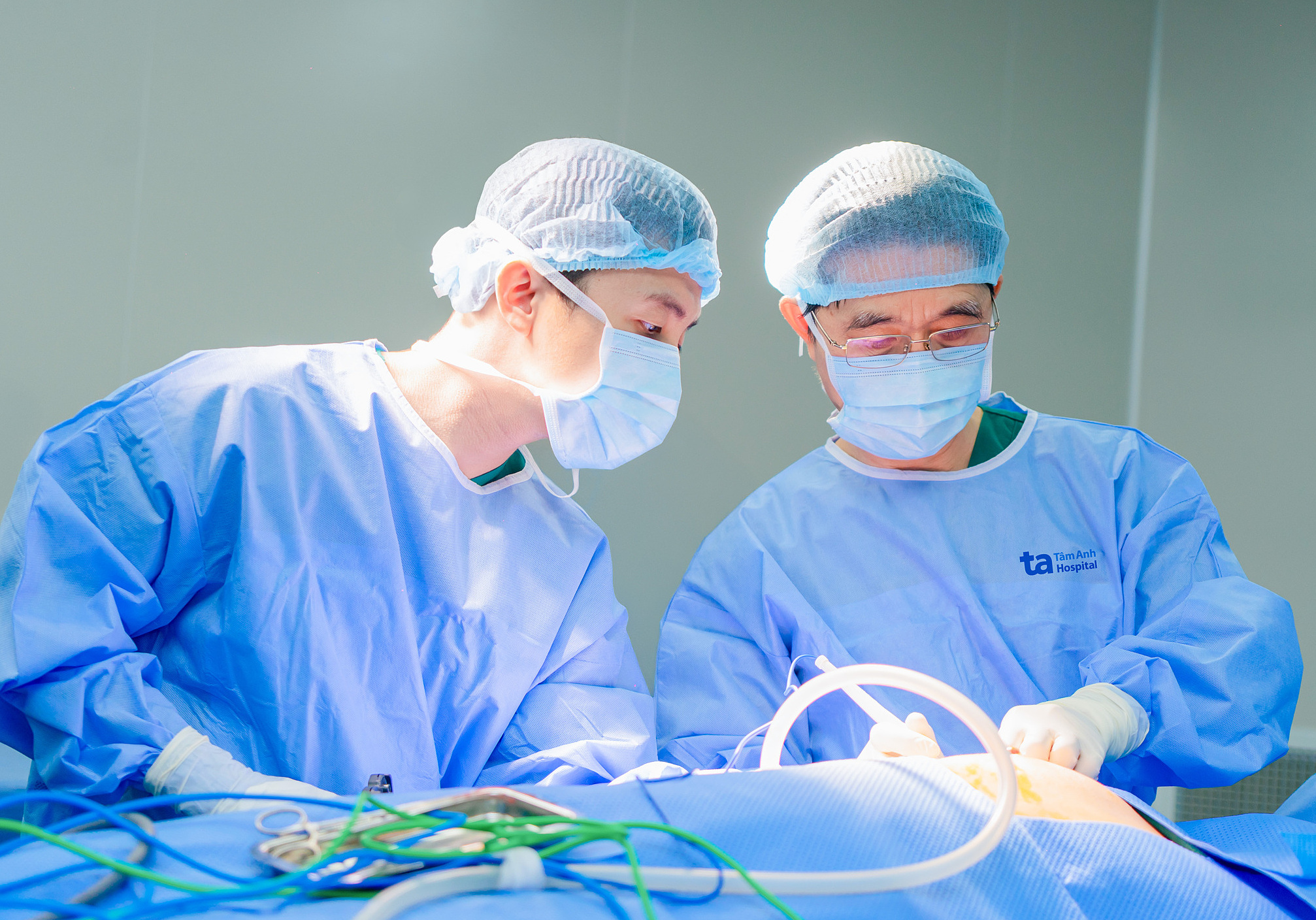 Dr. Dung (right) with his team during a robotic surgery. Illustrative photo: Tam Anh General Hospital.