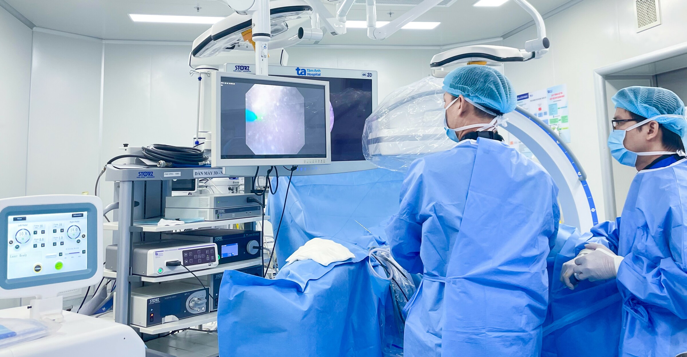 Doctor Cuong (left) and Doctor Phan Truong Nam, Specialist Level I, performed retrograde intrarenal surgery on Huy. Photo: Tam Anh General Hospital |