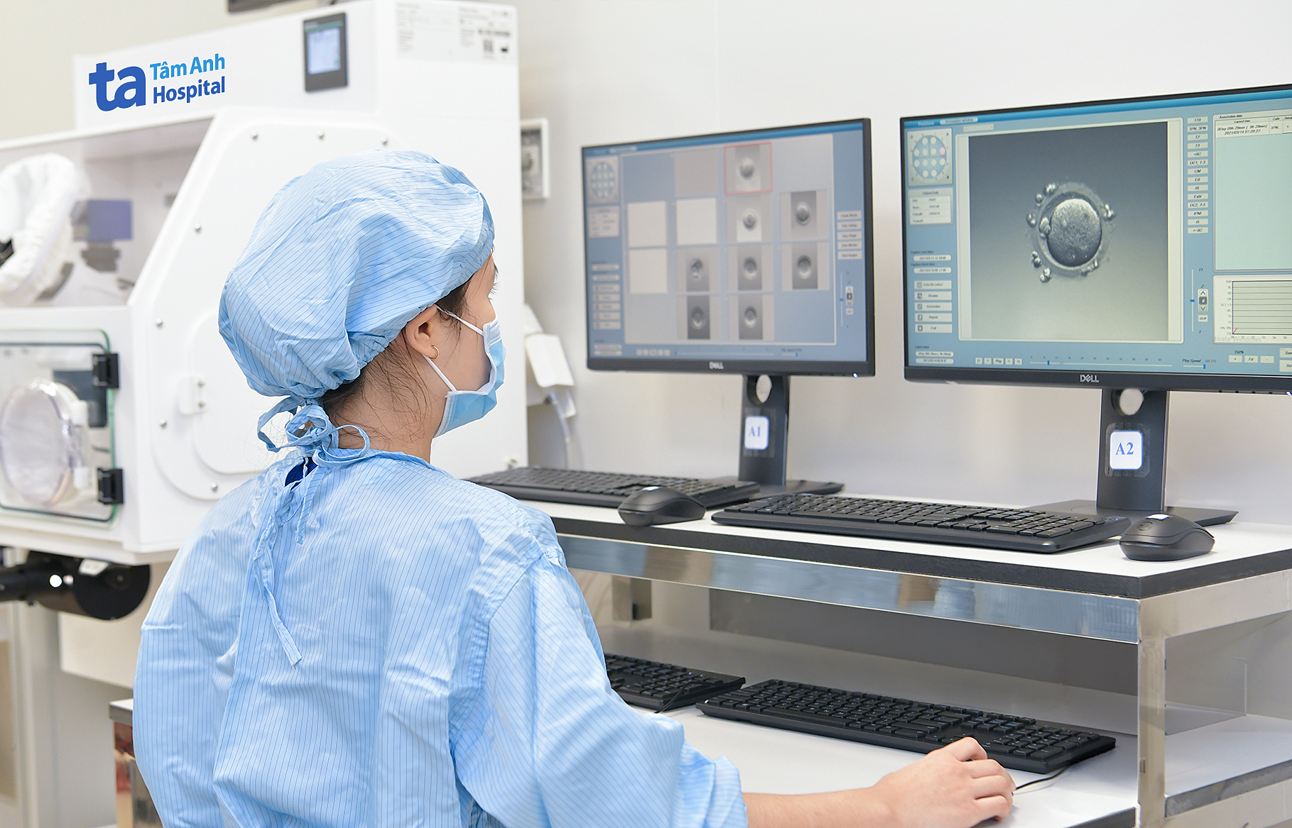 An embryologist assesses embryo development in a culture system equipped with a time-lapse camera and integrated AI. Photo: Tam Anh General Hospital