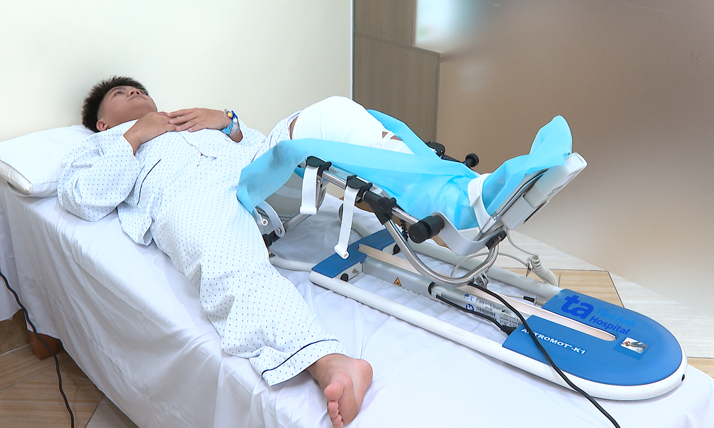 Qui undergoing rehabilitation with a passive lower limb flexion and extension machine. Photo: *Tam Anh General Hospital* |