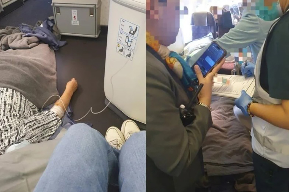 Professor Kim Jeong-hwan and his colleagues provided emergency aid to a patient on a flight from South Korea to the Philippines on 24/3. *Photo: Facebook Kim Jeong-hwan* |