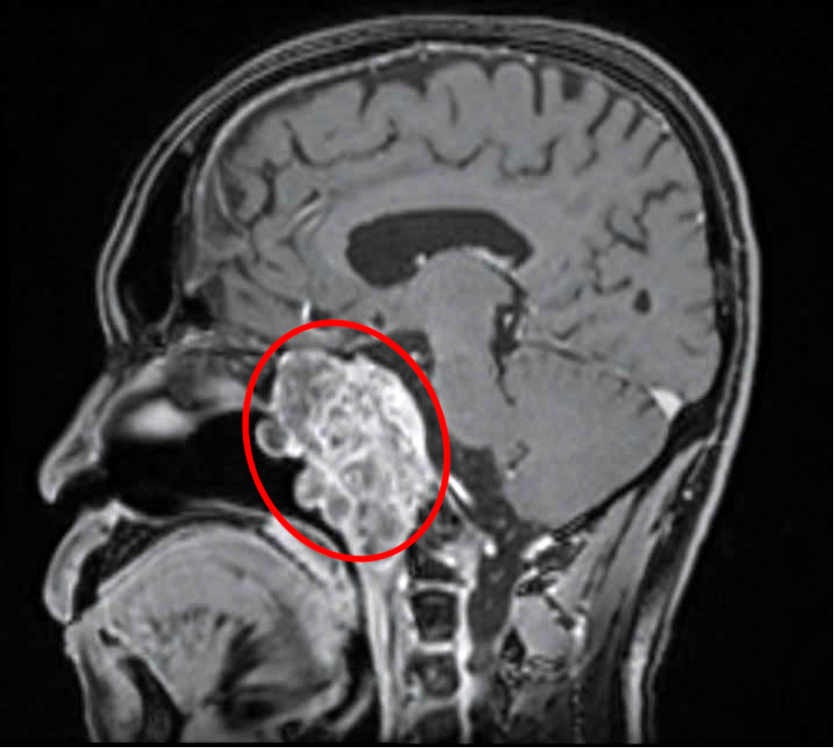 Hanh's tumor grew along the midline, extending backward and compressing the brainstem, causing headaches and dizziness. The tumor eroded bone and spread to both sides, invading part of the cavernous sinus and encasing major blood vessels. Hanh experienced double vision and limited eye movement due to the tumor's pressure on cranial nerves 3, 4, and 6.