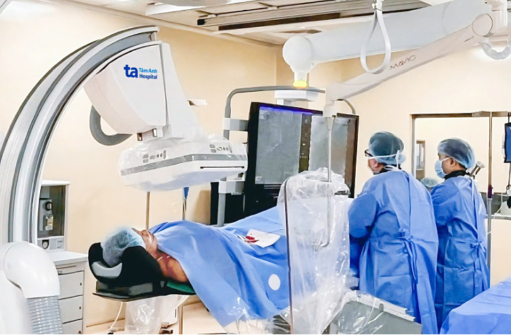 Doctors performing a thrombectomy in Mr. Huynh's brain using the DSA system. Photo: Tam Anh General Hospital |