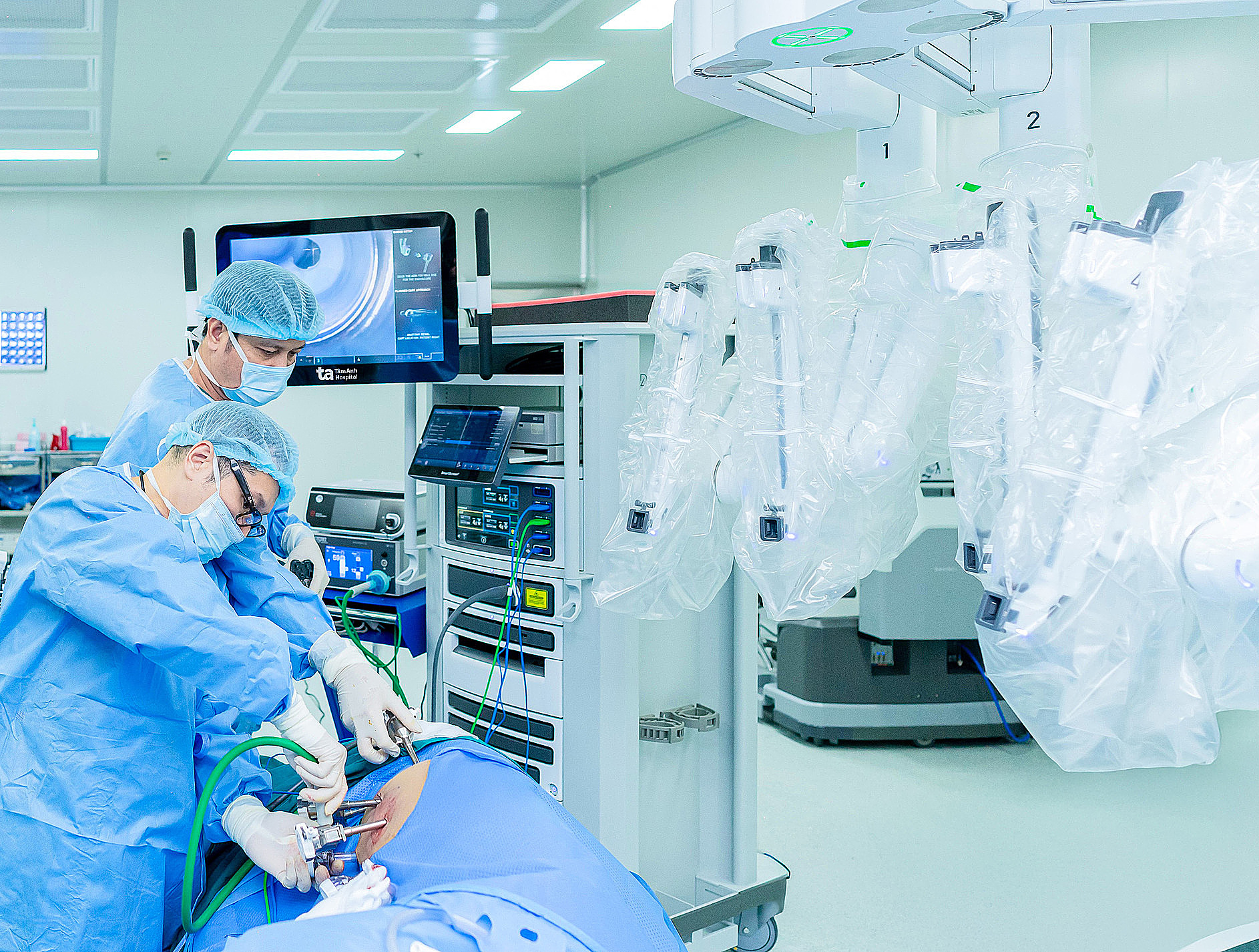 Doctor Duc (front) and Doctor Chau Minh Duy, First Degree Specialist, performed left kidney tumor removal surgery for Ms. Lanh using the Da Vinci Xi robot. Photo: Tam Anh General Hospital.