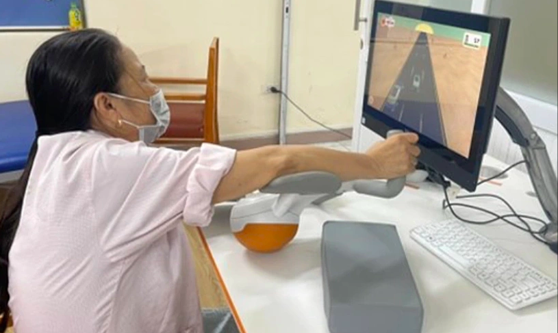Patients with stroke perform virtual reality-simulated exercises at Bach Mai Hospital. Photo: Hospital provided