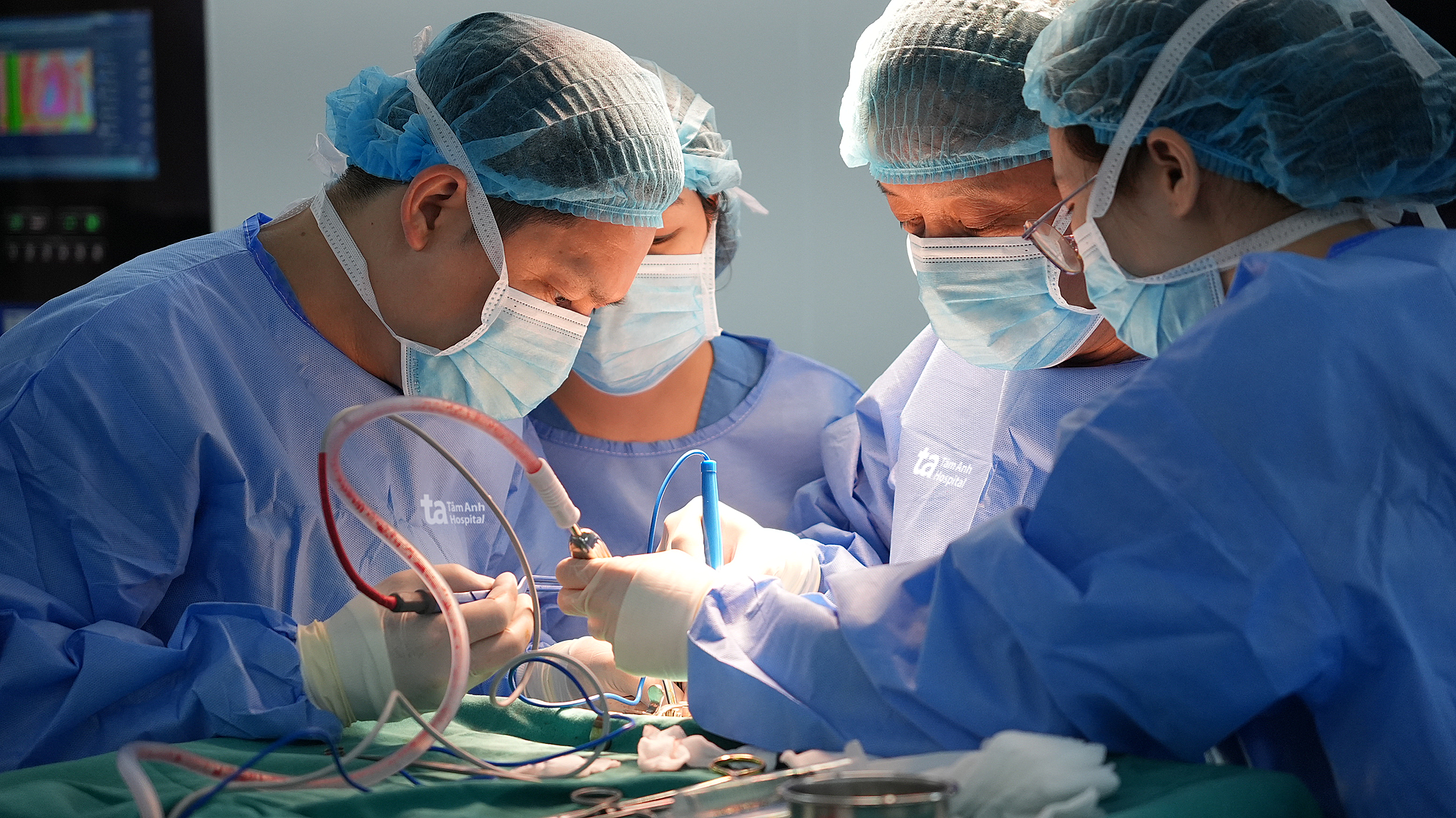 Associate Professor Ky and the surgical team perform endoscopic surgery to remove the tonsil cancer. Photo: Tam Anh General Hospital