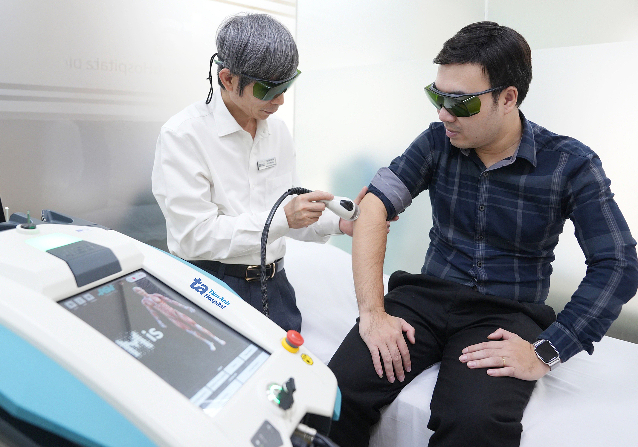 A person with elbow pain from high-intensity pickleball play receives laser treatment. Illustration: Tam Anh General Hospital