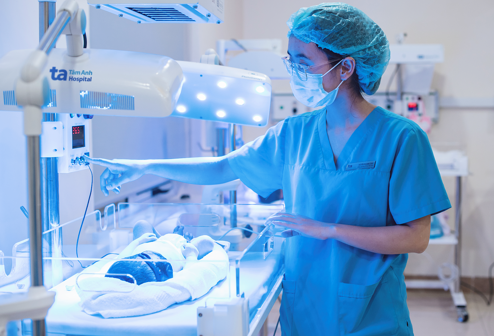 Newborn with jaundice receiving treatment at the Neonatology Department, Tam Anh Hanoi General Hospital. Photo: Bui Viet