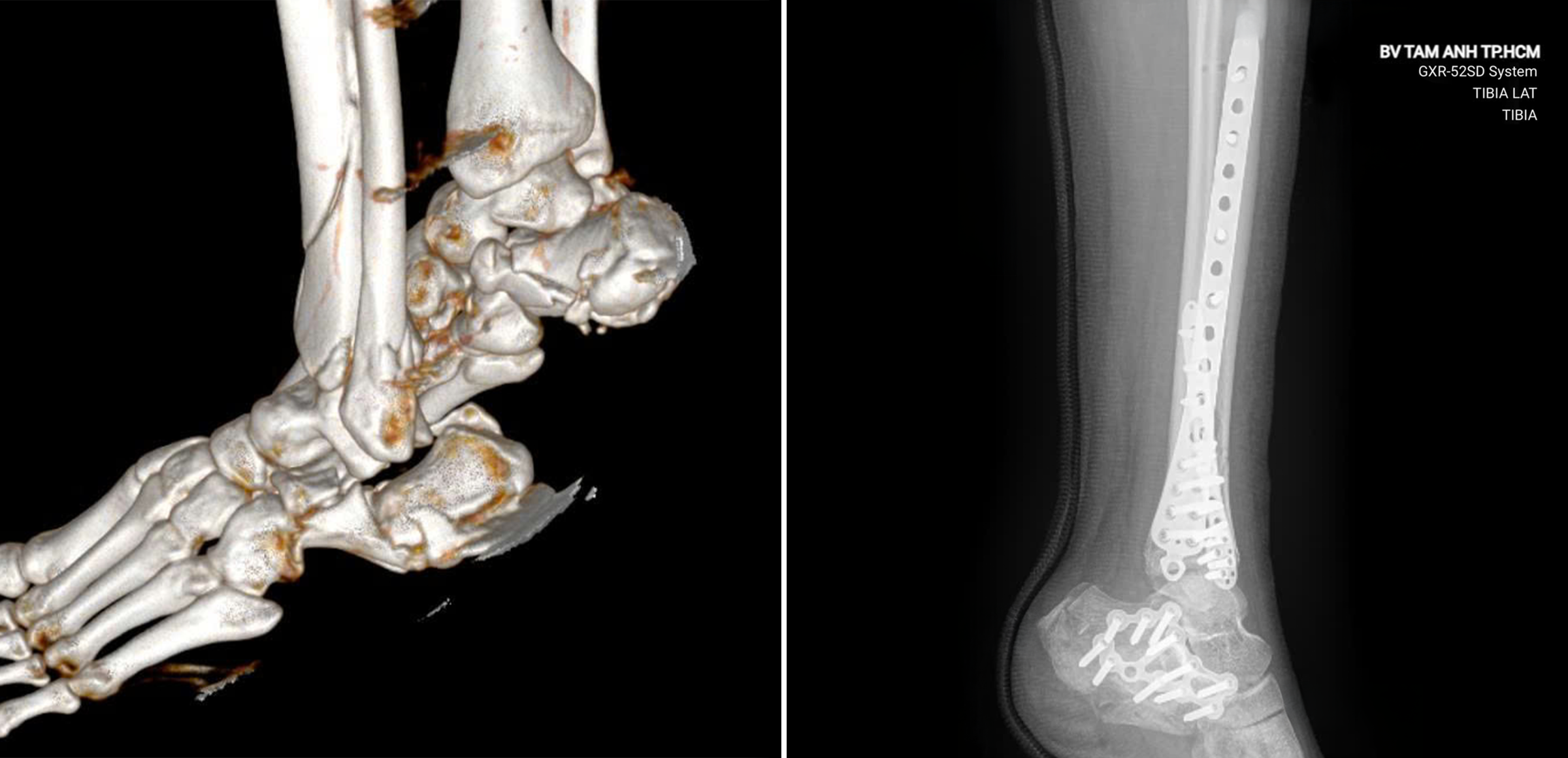 Dr. Nguyen Van Thanh of the Orthopedic and Trauma Center explained that Dara's extensive soft tissue damage and blood loss made immediate surgery risky. He was stabilized, his legs and spine were immobilized, and he received pain medication, anti-inflammatory drugs, blood transfusions, and wound care. After 10 days, when the blisters had subsided and the swelling reduced, he underwent surgery to repair the fractures.