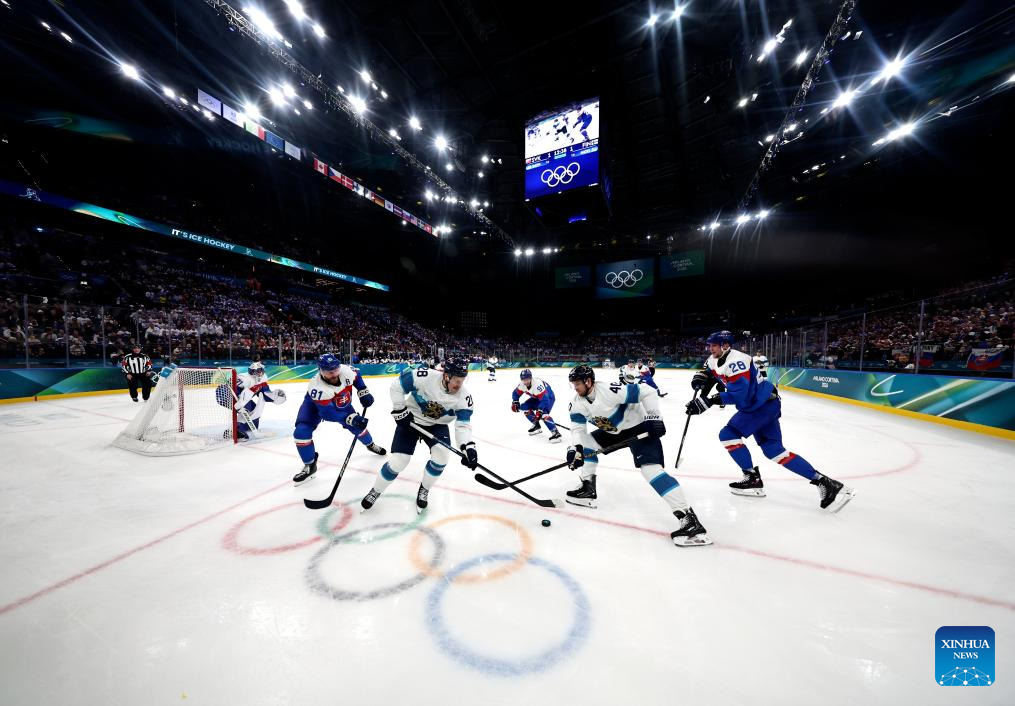 The Slovakian team (in blue) faces Finland in a men's ice hockey group B qualifying match at the Milan-Cortina 2026 Winter Olympics in Milan, Italy, on 11/2/2026. *Photo: Xinhua.*