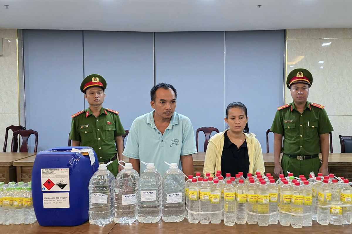 Authorities seized over 2,000 bottles (about 2,000 liters) of counterfeit vinegar and 20 cans of pure acetic acid (600 liters) from the factory. If used, these ingredients could have produced about 30,000 liters of counterfeit vinegar, posing a severe health risk to consumers.