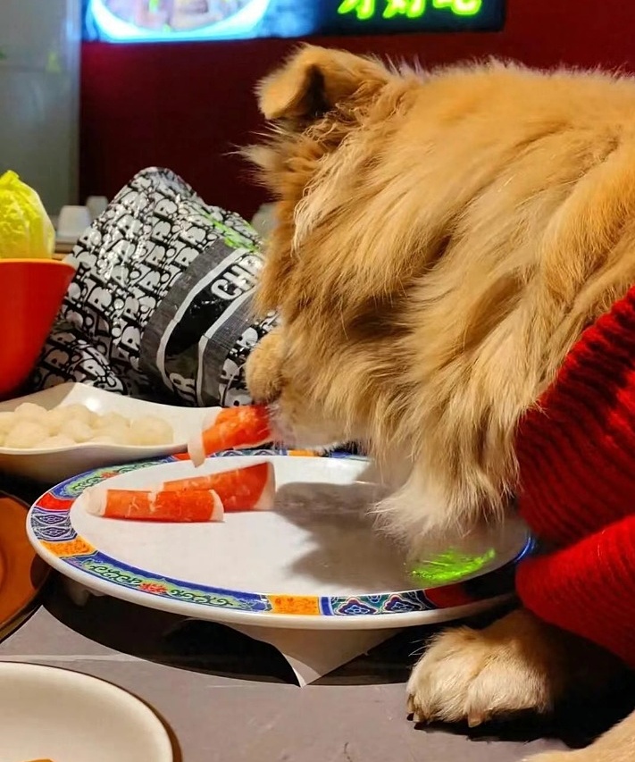 The pet dog eating meat from a plate in the restaurant. Photo: Chinese Daily |