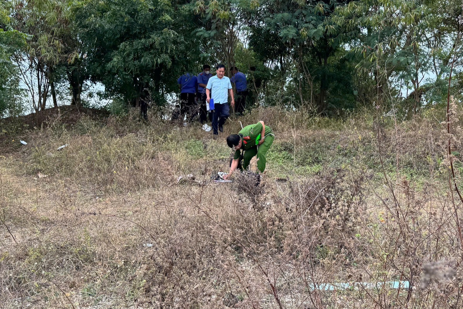 Authorities examining the scene where a human skeleton was discovered in Tien Thanh ward, on the afternoon of 6/1. *Nguyen Tu*
