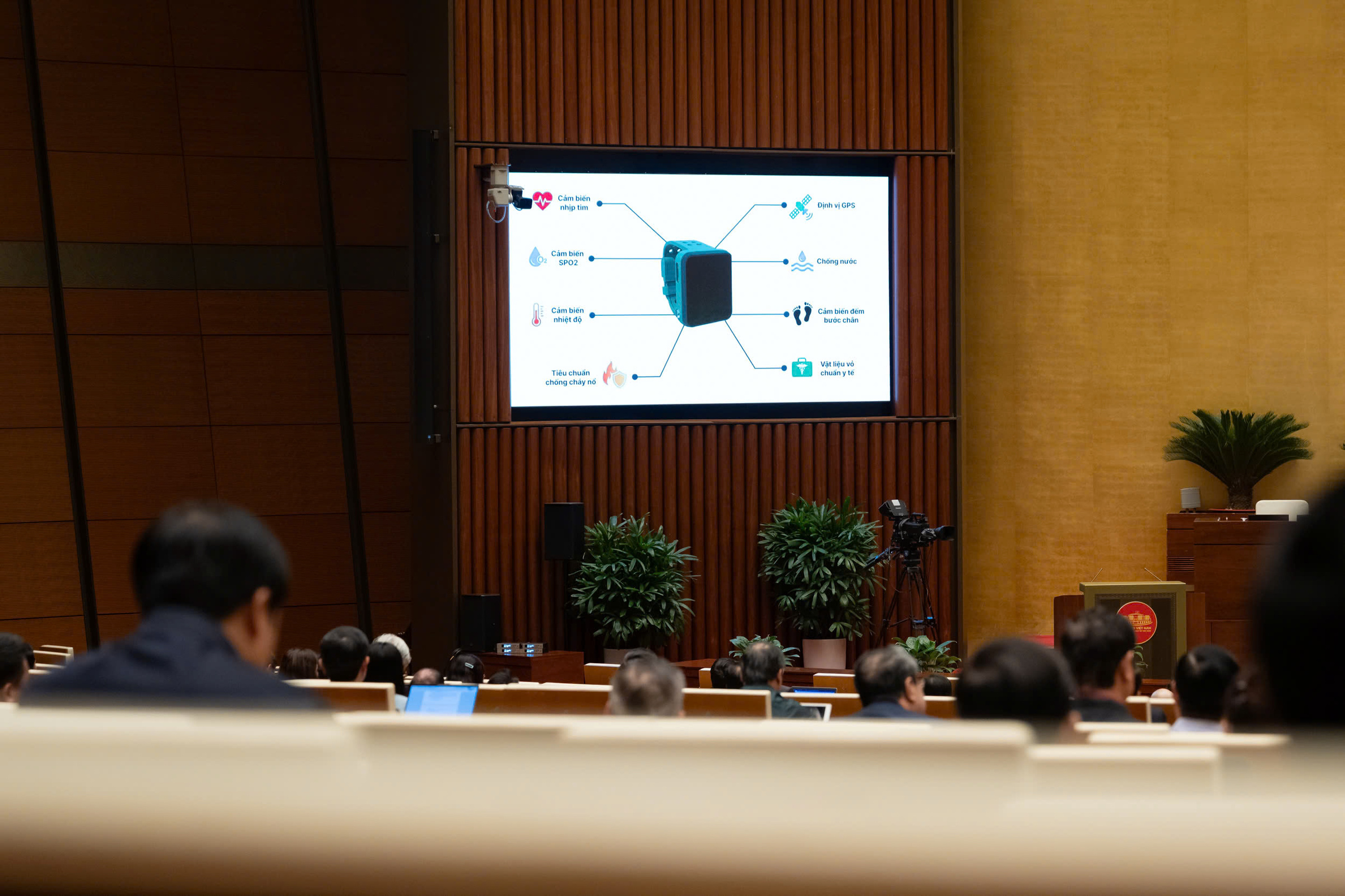 A video showcasing the wristband for managing rehabilitated individuals was shown before the National Assembly. *Hoang Phong* |